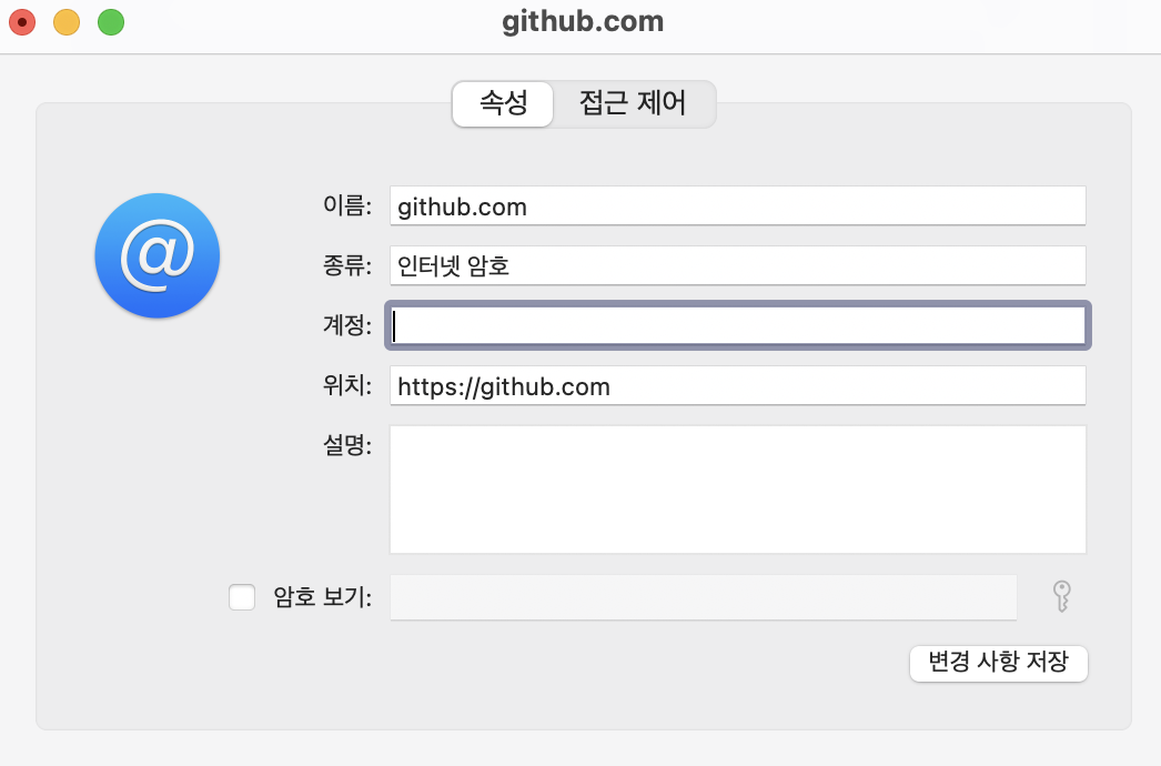 imac 검색 -> 키체인접근 -> github.com 검색 -> 계정에 github 로그인 이메일 적어줌