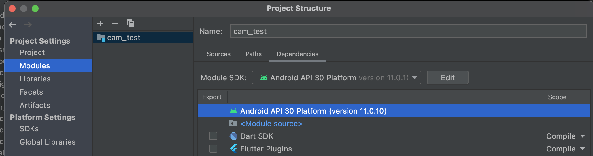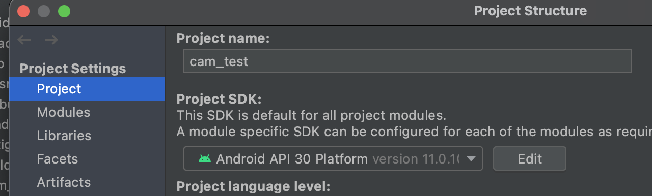 Project Structure -> Project 와 Module에서 SDK 버전을 선택해준다.