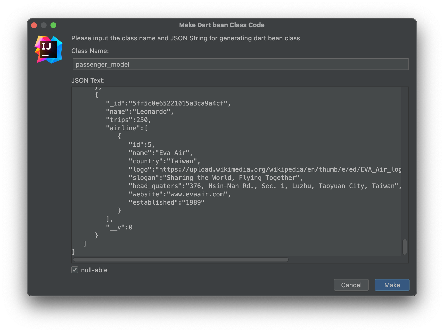 factory PassengerModelEntity.fromJson(Map<String, dynamic> json) => $PassengerModelEntityFromJson(json);