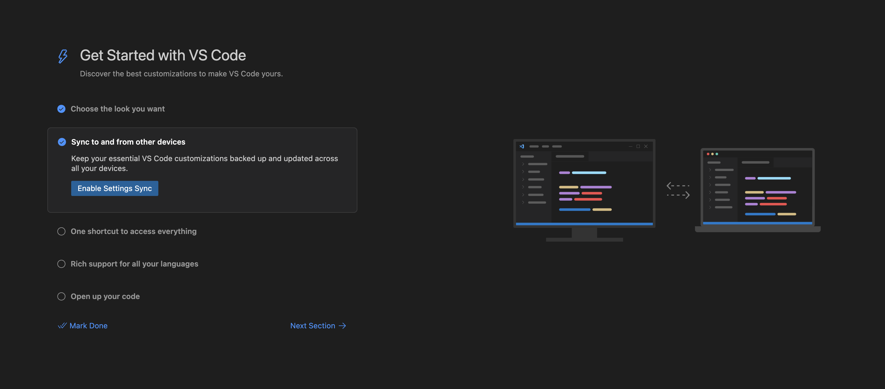 2. 다른 장치에서도 동기화 할것인가 - 할거면 Enable settings sync 눌러서 설정