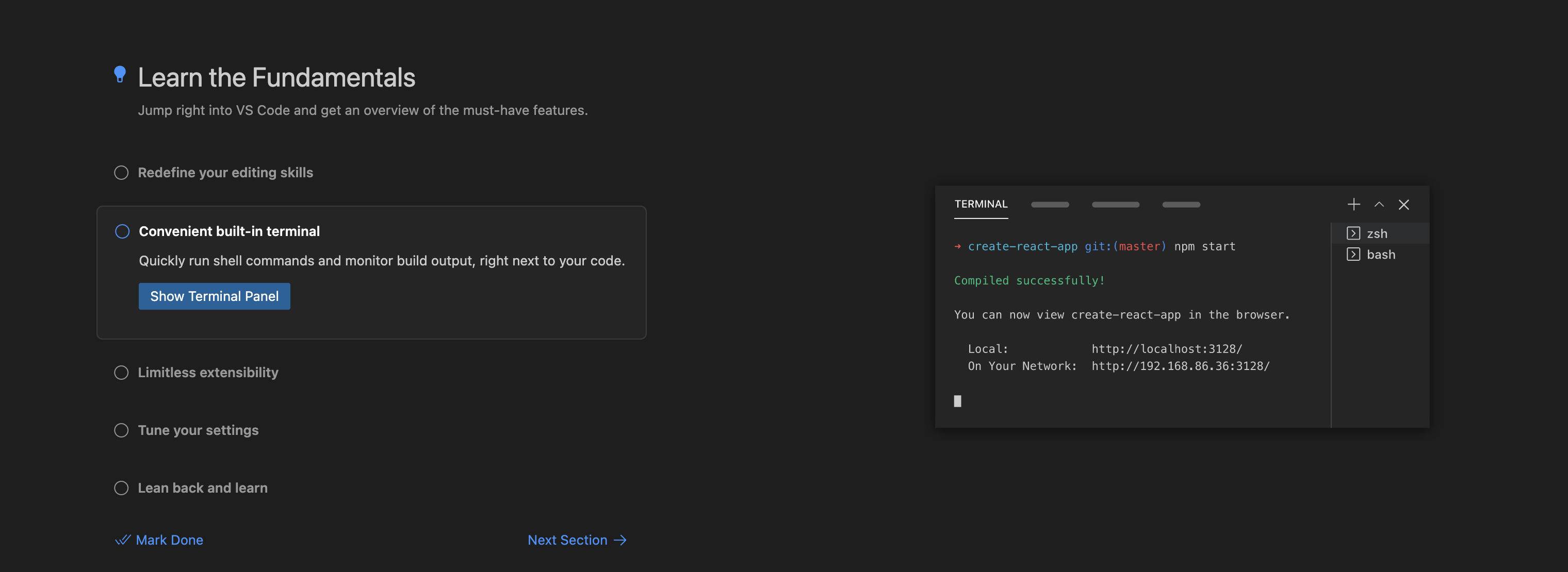 7. 코드 바로 옆에서 셸 명령을 빠르게 출력하고 빌드 출력을 모니터링 (누르면 밑에 terminal 창 생김)