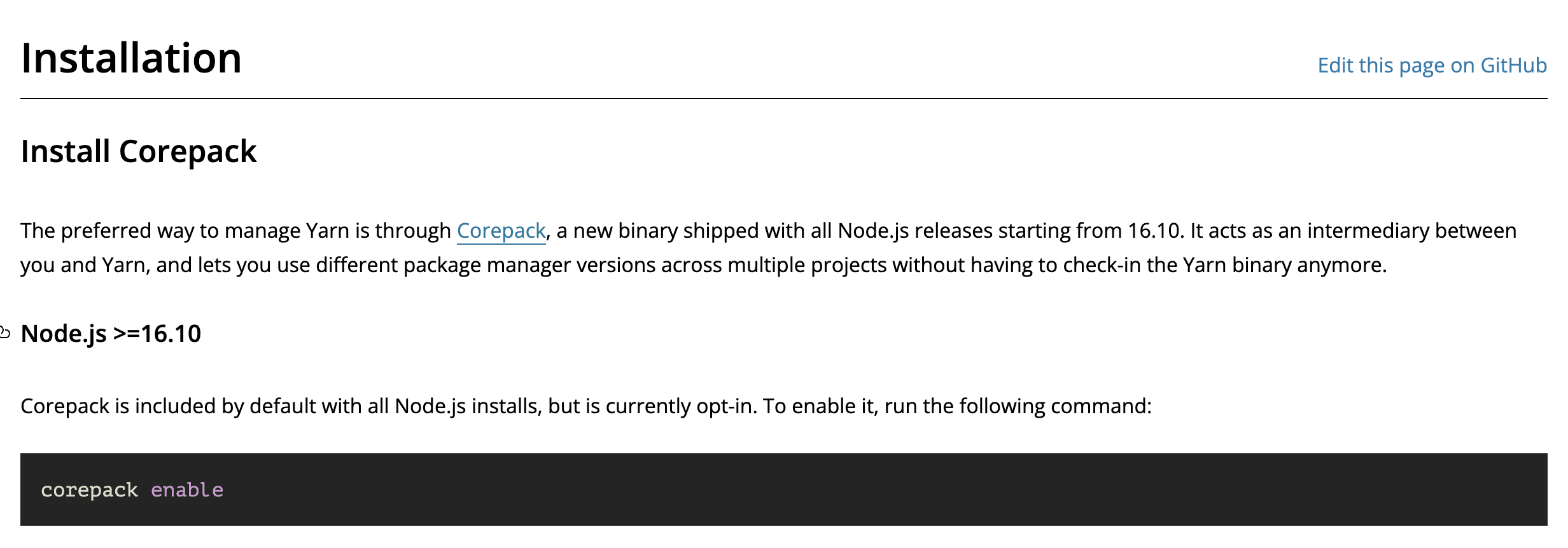 Node.js 버전이 16.10 이상이면 'corepack enable' 명령어로 설치 가능하다고했는데