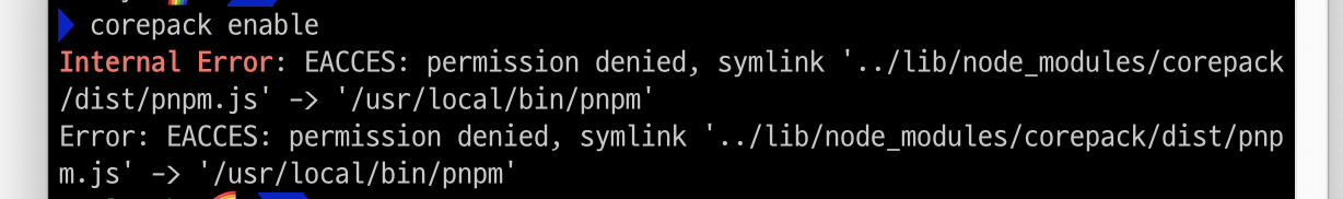'Internal Error: EACCES: permission denied, symlink '../lib/node_modules/corepack/dist/pnpm.js' -> '/usr/local/bin/pnpm'