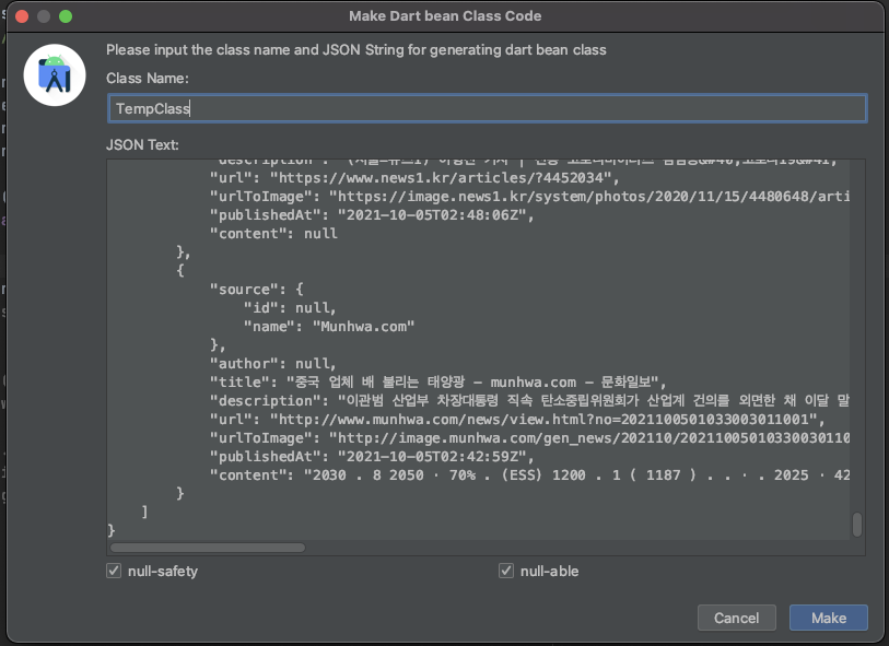AndroidStudio 기준 Shift 2번 동작 -> plugins -> FlutterJsonBeanFactory 설치 -> AndroidStudio 재시작
