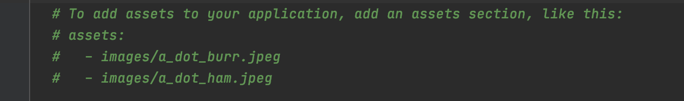 pubspec.yaml 파일 내부에 해당 부분 주석 풀고 이미지 등록