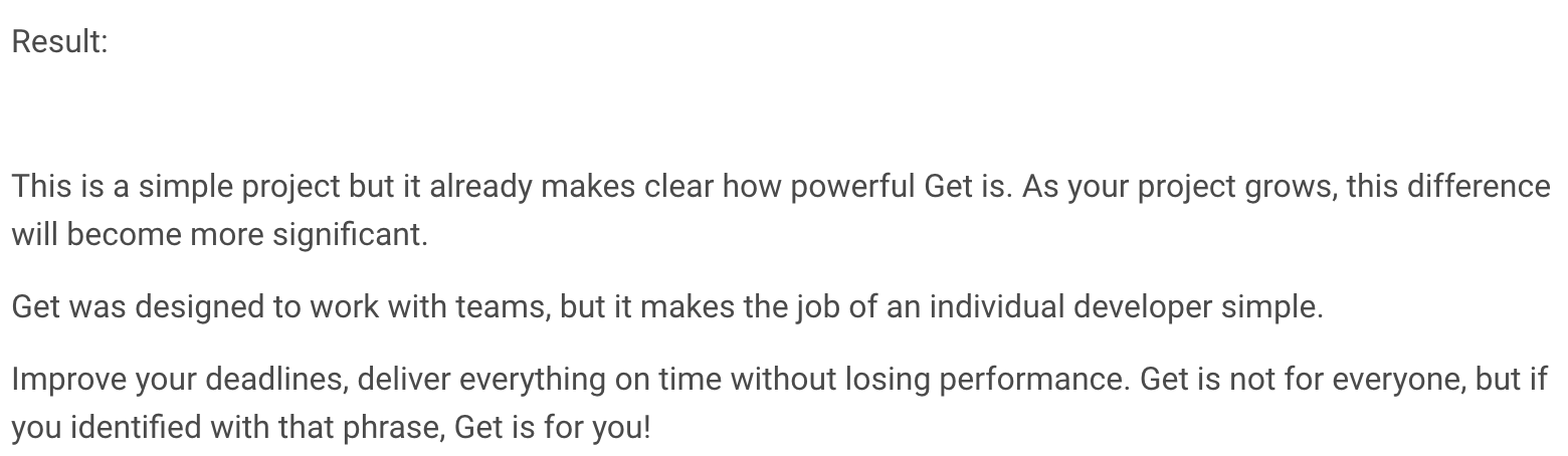 이것은 간단한 프로젝트이지만 Get이 얼마나 강력한지 이미 명확하게 보여줍니다. 프로젝트가 성장함에 따라 이 차이는 더욱 중요해집니다.