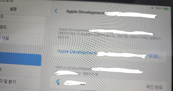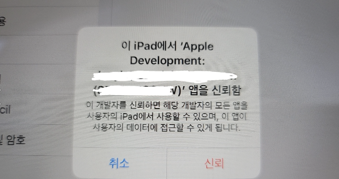 설정 -> 일반 -> VPN 및 기기 관리 -> '개발자앱' 항목에서 앱 선택 -> 파란색글씨(Apple Development: ~~) 선택 -> 메시지박스의 '신뢰'버튼 선택