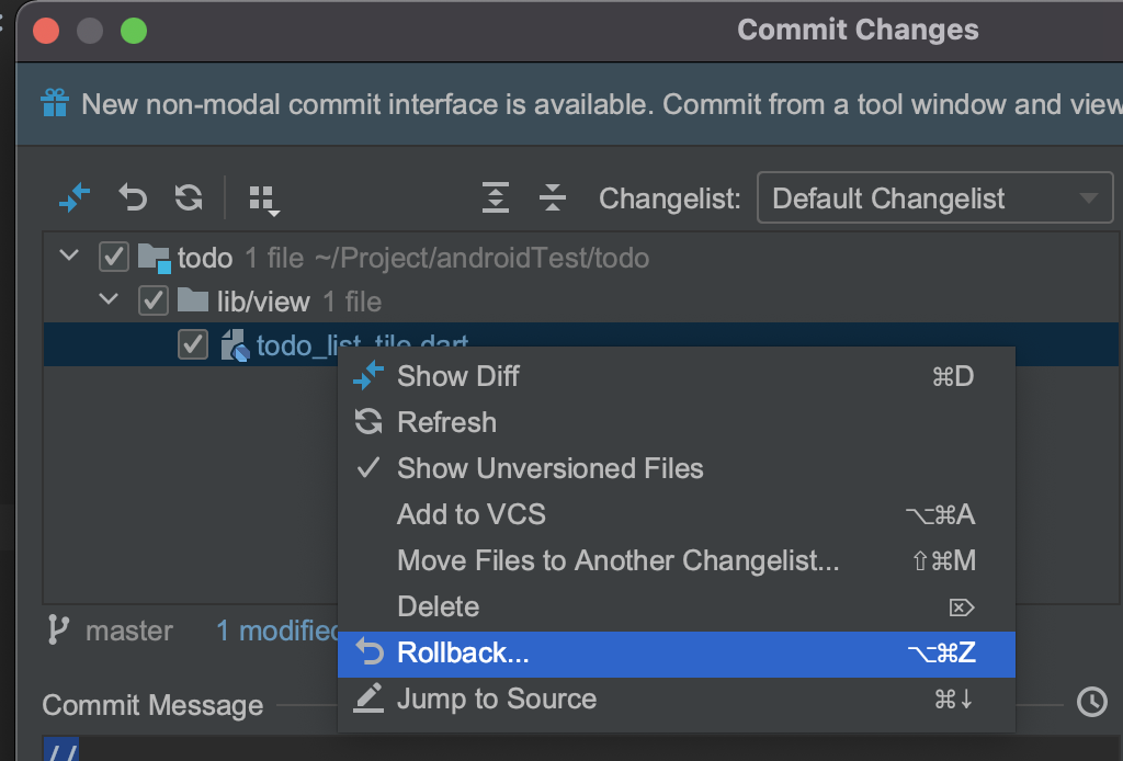 커밋버튼 -> dart file 우클릭 -> Rollback...